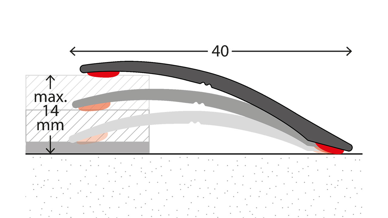 Das Anpassungsprofil 841 ist ein selbstklebendes Aluminium-Anpassungsprofil für einen sauberen Übergang von einem höheren Bodenbelag auf eine niedrigere Anschlussfläche. Es gleicht Höhenunterschiede bis 14 mm aus und eignet sich u. a. für Designbeläge (Klickvinyl, Loose Lay & Klebevinyl), Laminat/Multilayer und Fertigparkett.